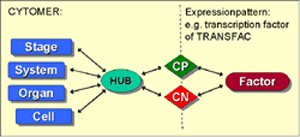 We have developed a relational database system called CYTOMER®, which aims at providing a comprehensive overview on all expression sources. Gene expression sources are organs, tissues, cell types in the different developmental stages of an organism. Therefore, CYTOMER® is a database about physiological systems, developmental stages, anatomical structures, substructures and the constituting cell-types (Wingender et al., 2000). The central table of CYTOMER® is a list called "HUB", that links entries of the four other tables. It represents anatomical/ histological knowledge about which cells occur with what kind of function in which organs and at what stages (figure 1).