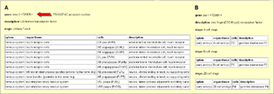 | The query of a single gene results in a tabulated report of expression patterns, which includes both temporal and spatial patterns. See figure 5 for examples. |