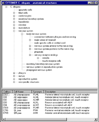 | The anatomical structures of C. elegans are illustrated in a hierarchical tree. We defined 12 organs on the top level of the hierarchy and 230 substructures. The corrsponding 959 somatic cells are linked to the lowest level of the hierarchy (figure 4). We also included the complete cell lineage, which describes the embryonic development of C. elegans. As an example the screenshot in figure 4 shows in an adult stage animal the 8 touch receptor cells, which are part of the nervous system. |