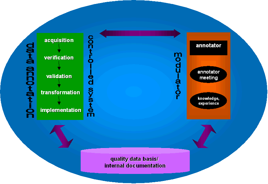 shows a simple model for the regulation of quality analogous to control theory. The annotator as a modulator regulates the process of data annotation (the controlled system) and can fall back on the pool of quality data. The regular annotator meeting serves as a communication tool, important for the transfer of knowledge, definition of format, syntax and other conventions. The aim of the internal documentation system is to collect all this information, being itself part of a company-wide information system.